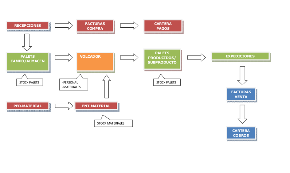 - Volcado: En este proceso se registra la mercancía que se gasta en la entrada al volcador y la mercancía que se produce palets tipo P o S. Se pueden registrar los gastos de material y de personal asociadas a cada volcado. Se dispone de una gestión de materiales para los pedidos,albaranes y facturas de compra de materiales del almacén.