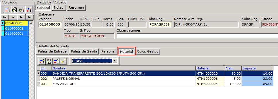 En el proceso productivo se utilizan distintos materiales: cajas, palets, material de embalaje, etc. En el sistema se puede llevar un control de stock de los materiales que se utilizan en la producción con el fin de garantizar que hay stock suficiente de materiales para la confección de la fruta.