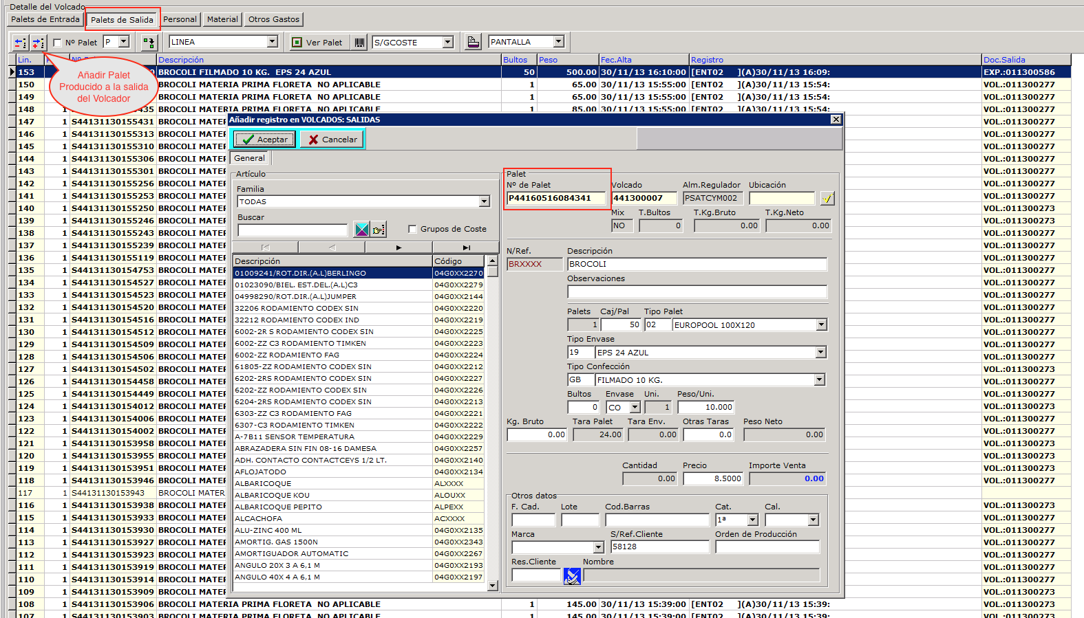 A continuación debemos indicar cuales son los palets que entramos al volcador, es decir los palets que gastamos, estos palets estarán PENDIENTES y normalmente serán de campo (C) o de subproducto (S). Los palets se pueden ir cargando seleccionado con una lista o usando un lector de código de barras.