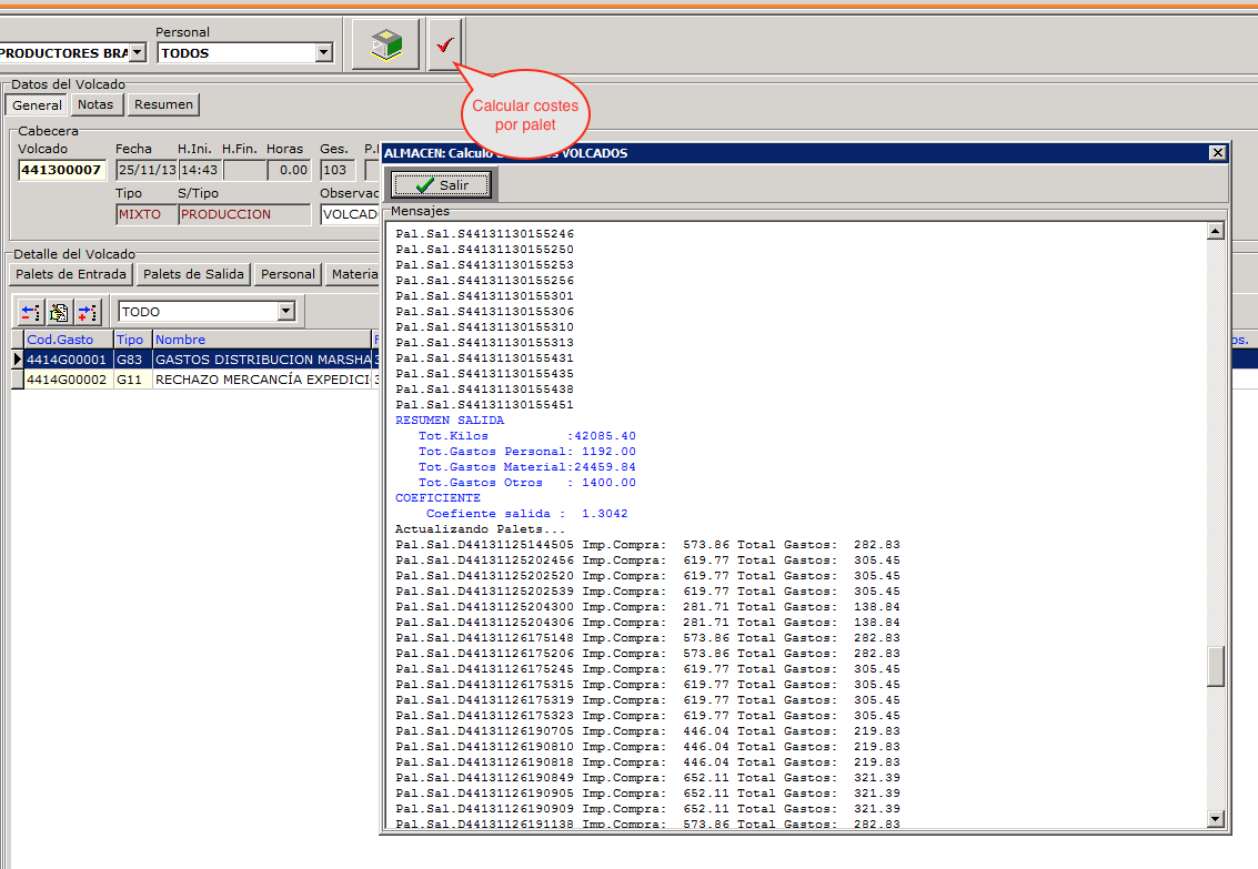 Con esta información el sistema puede calcular el precio de coste de cada palet usando la opción que se muestra en la imagen. El precio de coste se calcula teniendo en cuenta el valor de compra de los palets de entrada, los palets producidos y todos sus gastos asociados.