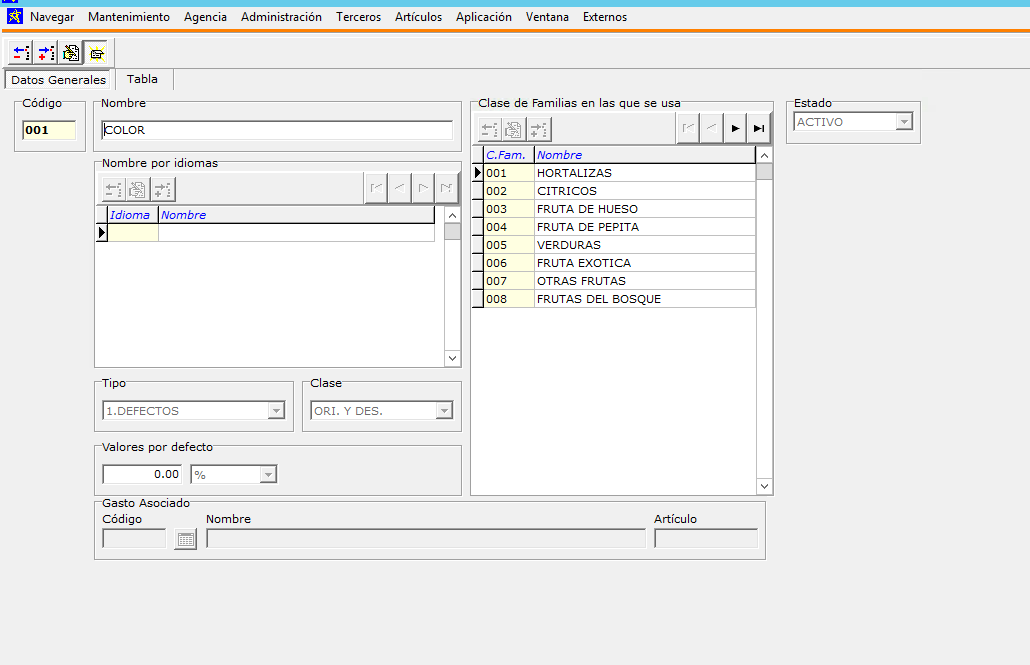 Como primer paso, el Jefe de calidad debe definir que elementos quiere controlar y asociarlos a una familia, esto se hace en la opción Agencia / Auxiliares / Tipos de registros de calidad.