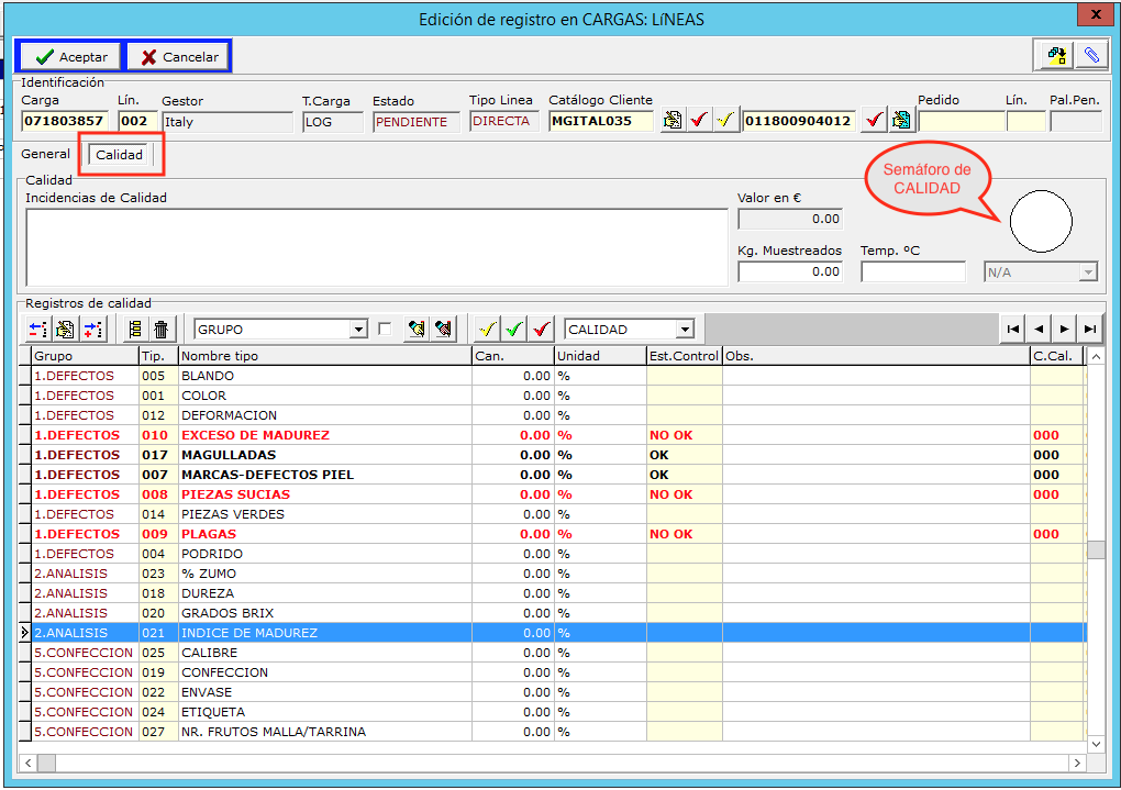 El controlador de calidad puede registrar para cada elemento los valores que haya muestreado indicando su valor y si es correcto o no. El semáforo de calidad se pondrá rojo si alguno de los elementos no es correcto y verde si todos lo son.