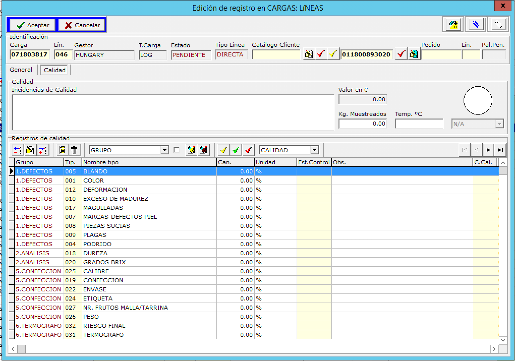 Los controladores de calidad deben informar de los valores de cada elemento así como indicar si es correcto o no. A partir de la lista de elementos se calcula el semáforo de calidad. Es posible indicar notas y comentarios en cada elemento, así como el valor medido y su unidad.