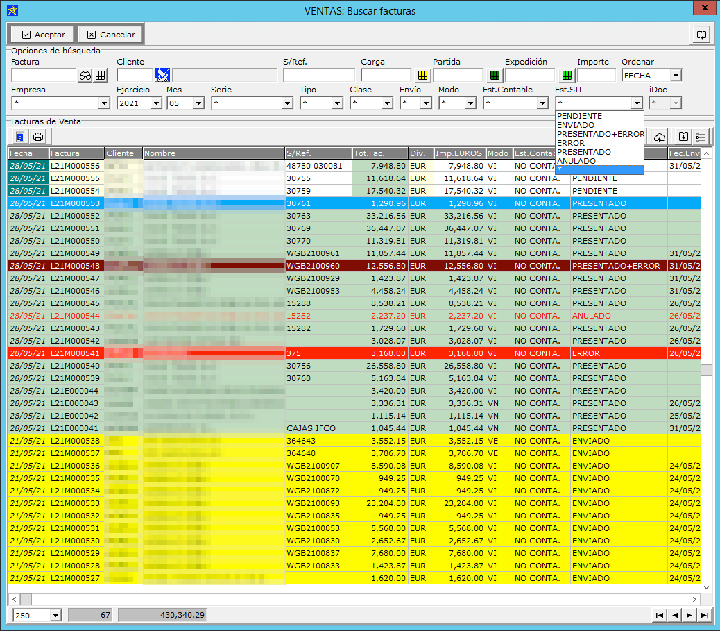 - ANULADA: La factura ha sido anulada en el SII. (La agencia tributaria no borra el registro sino que lo marca como anulado).