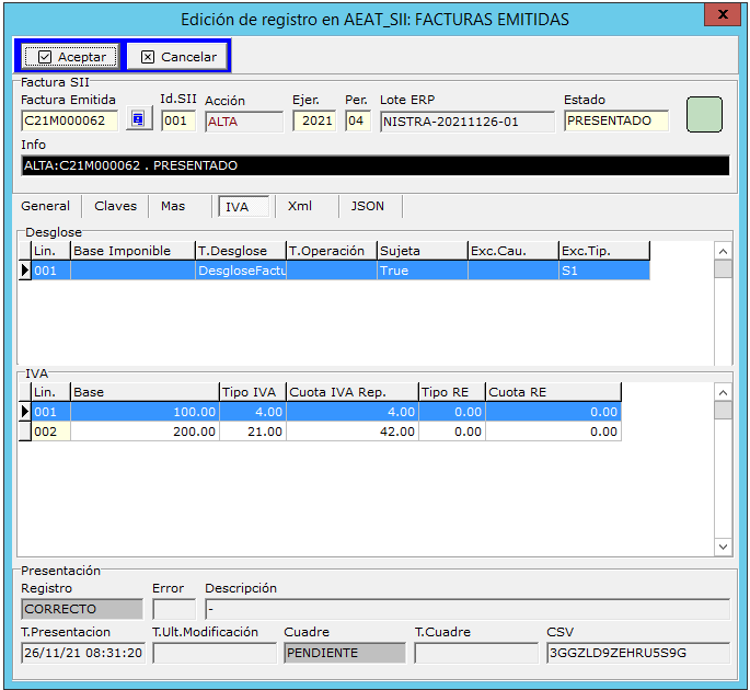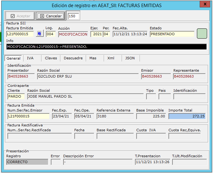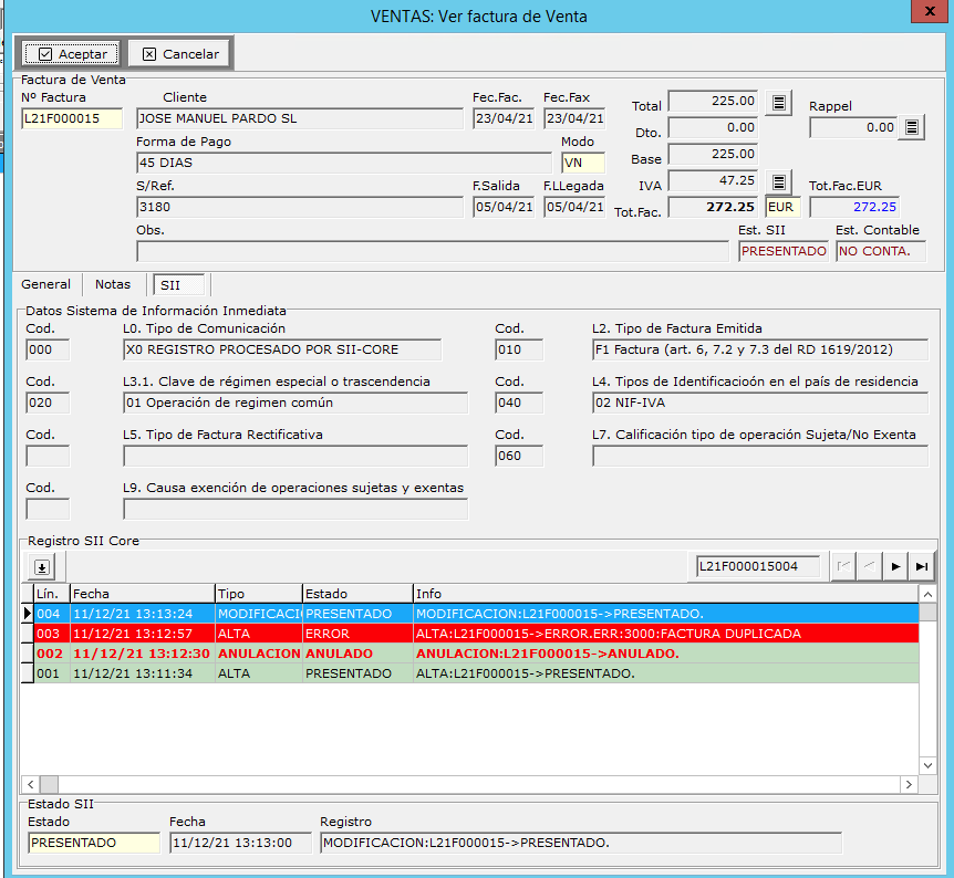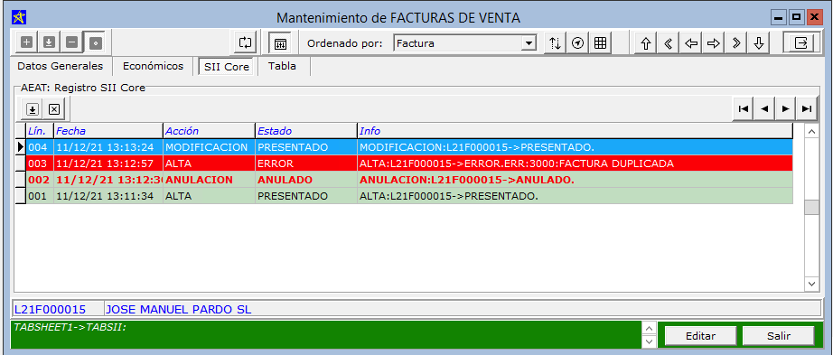 Para cada factura podremos conocer el estado actual de presentación, así como el histórico de todas las acciones realizadas en el SII, las facturas rechazadas podrán ser modificadas para presentarlas de nuevo, además podremos anular facturas directamente en el SII.