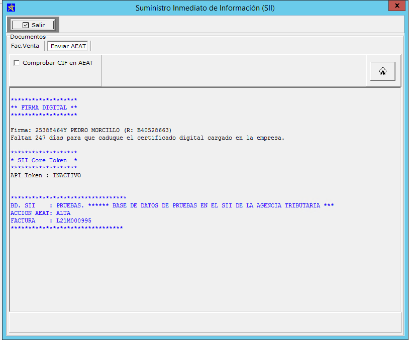 La presentación del SII ante la Agencia tributaria requiere tener cargado un certificado digital valido en en la ruta Administracion/Auxiliares/Empresas.