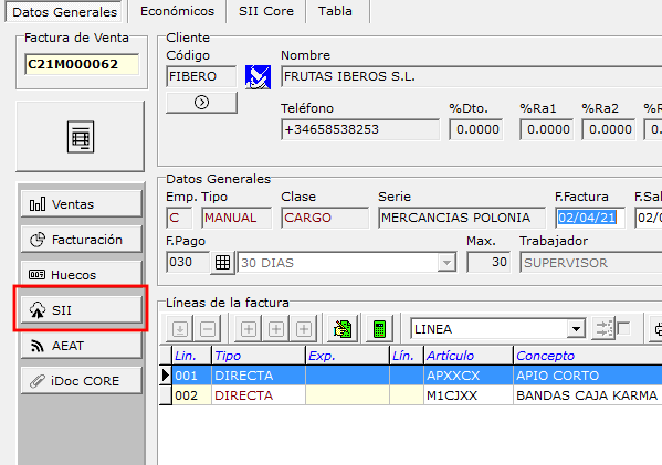 Las facturas se presentan por lotes o grupos directamente desde el GestFrut utilizando el botón de la barra lateral SII que se encuentra en el mantenimiento de las factura de venta y compra.