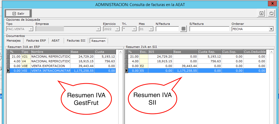 Se dispone de una opción que permite contrastar para cada mes el resumen de IVA de GestFrut contra el resumen de IVA descargado del SII, de esta forma podemos estar seguros de que el IVA declarado en la agencia tributaria cuadra con el IVA registrado en GestFrut.