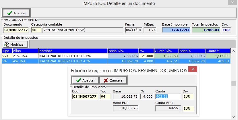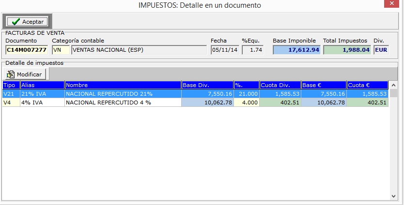 En el detalle de impuestos se muestran los tipos aplicados, las bases y las cuotas. Tenga en cuenta que esa será la información que se traspasará a la contabilidad..