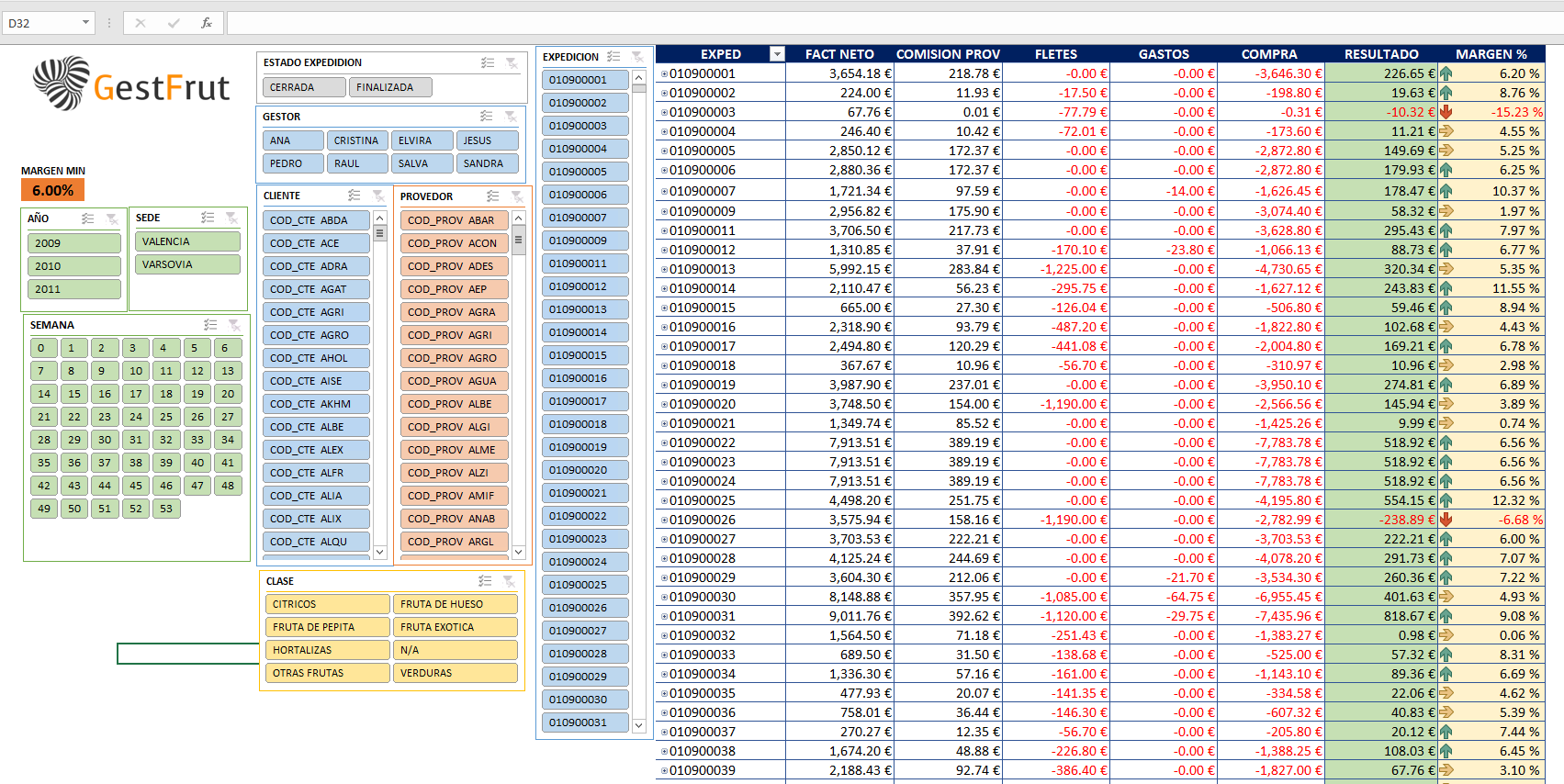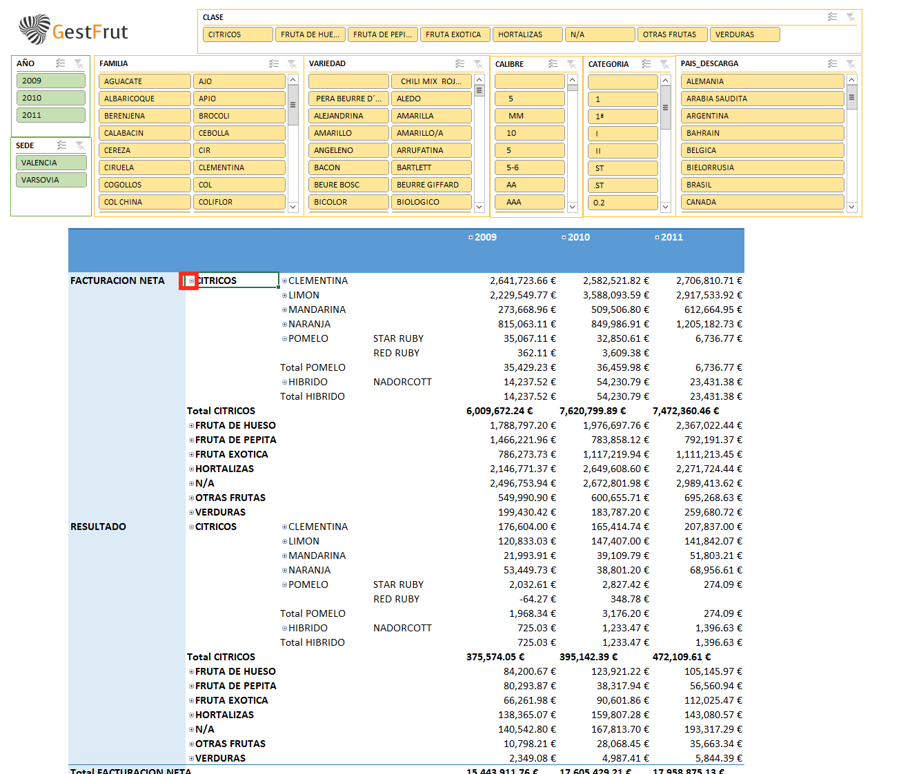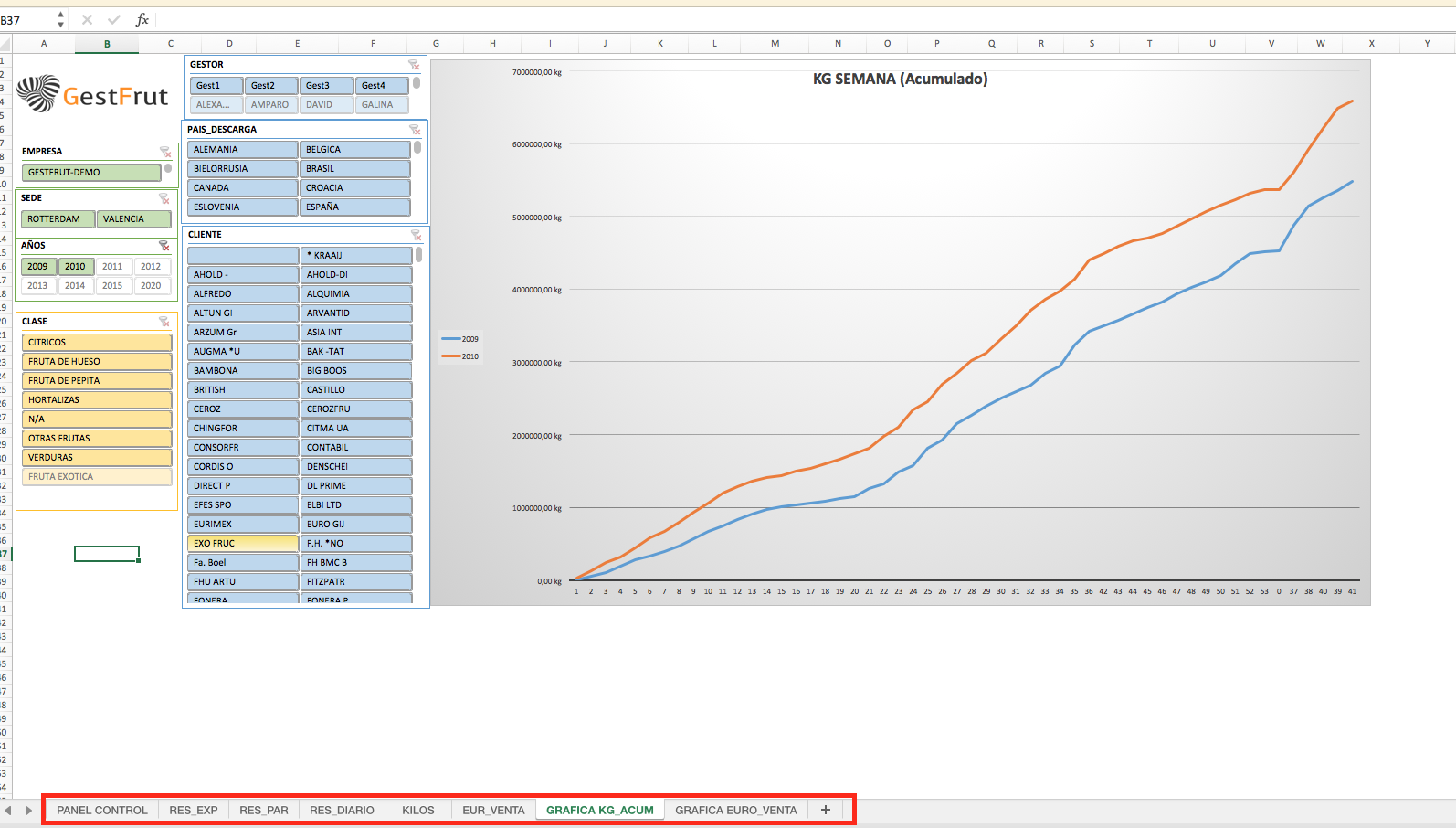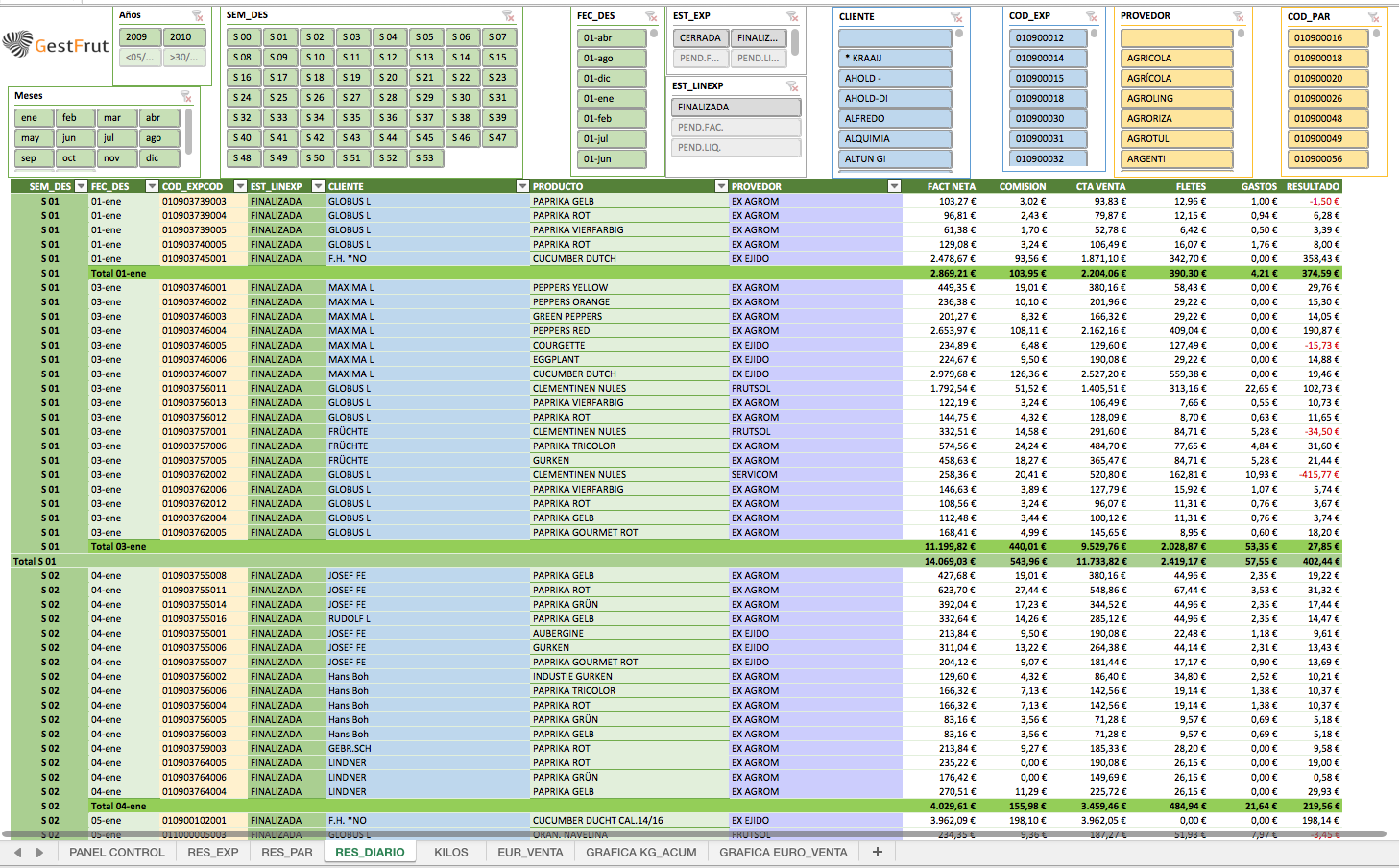 En cada pestaña se puede buscar los resultados por año, mes, semana, clase, familia, variedad, sedes, clientes, provedores, gestor...etc.