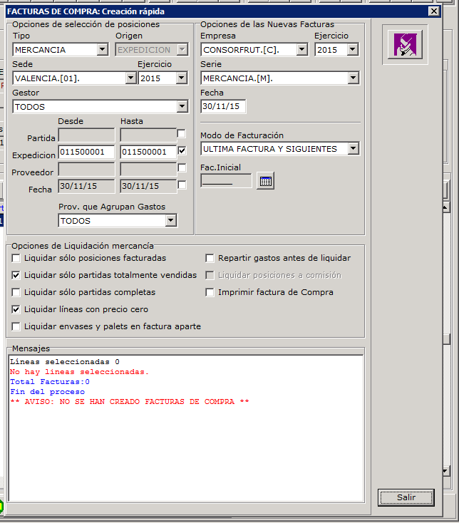 Si la opción ‘Liquidar sólo partidas a completas’ está marcada, quiere decir que cuando una partida se vende en varias expediciones, todas ellas deben cumplir las tres condiciones mencionadas.
