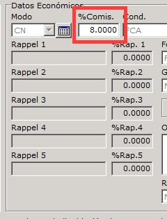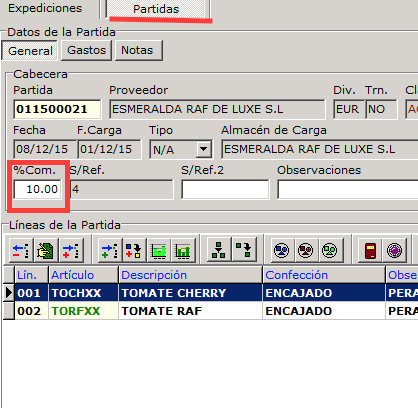 Como se puede ver el campo está en gris, ya que no es editable. Si deseamos cambiar el porcentaje de comisión tenemos que ir a la partida: