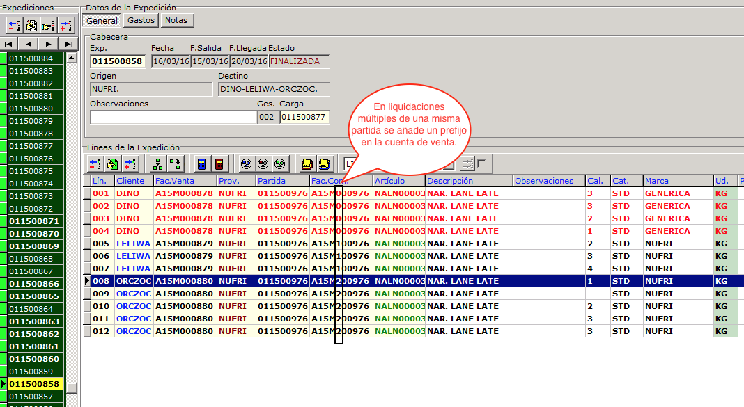El sistema creará una cuenta de venta con las líneas autorizadas, repitiendo el proceso se conseguirán varias liquidaciones. Observer que la segunda liquidación de la partida tiene un prefijo 1, la tercera un prefijo 2 etc.