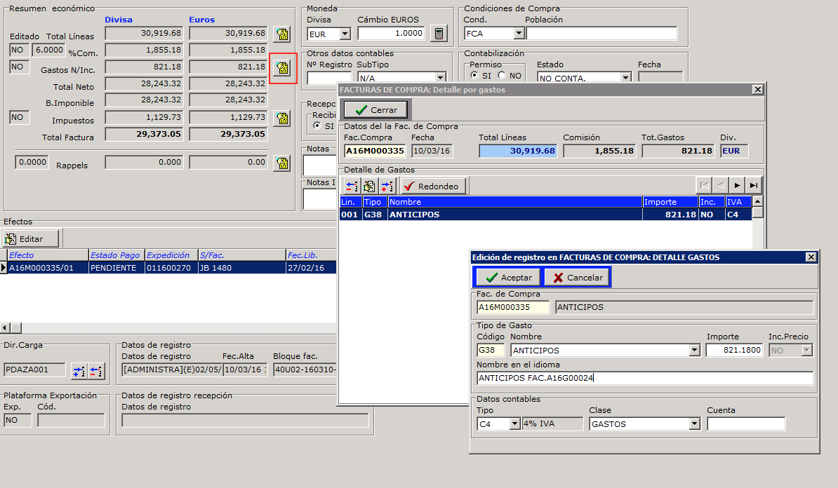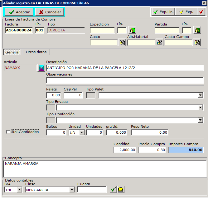 - 4.- Al final de la campaña, una vez se dispongas de cuentas de venta de ese agricultor, habrá que descontar el anticipo. Esto se hace desde el botón de Gastos No Incluidos, desde donde se añadirá el importe del anticipo que se le entregó.