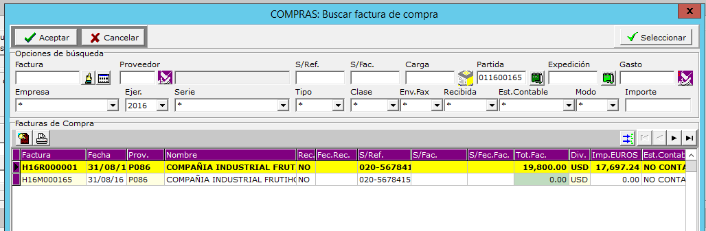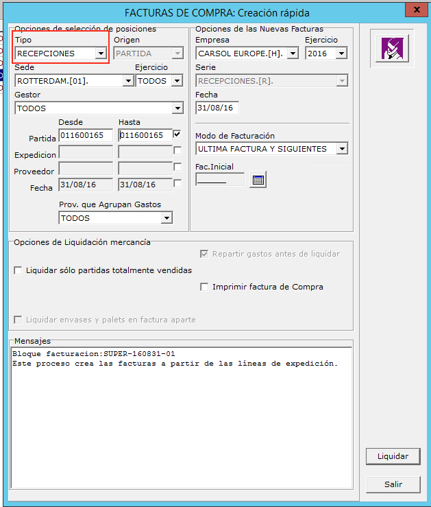 - 2.-Para liquidar la partida use Administración/Facturas de Compra/Generación rápida y seleccione tipo RECEPCION y acote la partida que desea liquidar.
