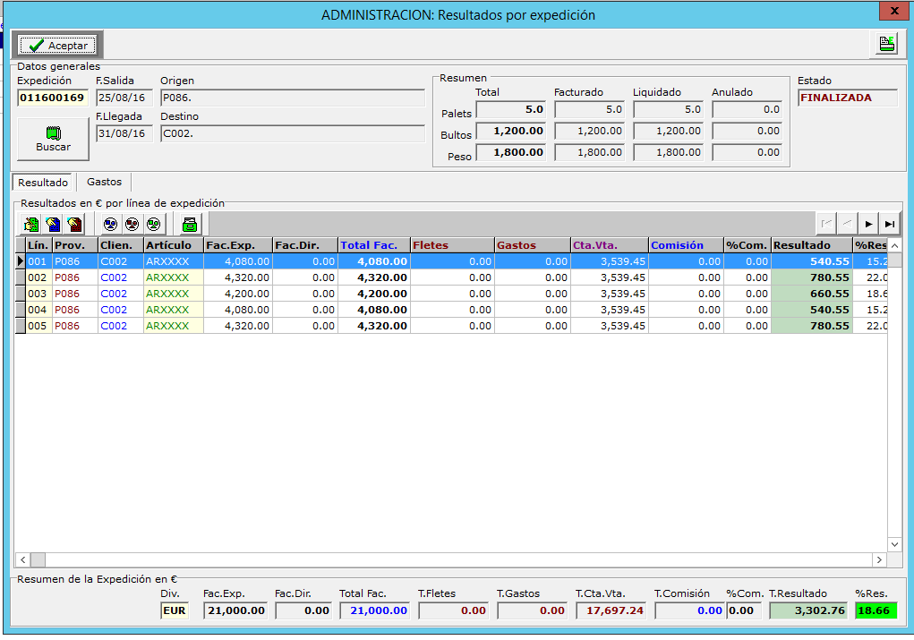 - 4.- A continuación se vende la mercancía en las expediciones y se facturar al cliente . Finalmente hay que hacer una segunda liquidación en la serie M para finalizar las expediciones. El sistema creará una segunda liquidación con el número de la partida por importe 0.