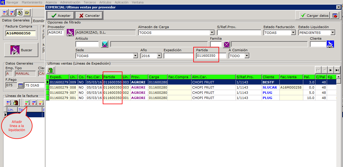 A continuación, usamos el primer botón de añadir líneas desde la expedición y seleccionamos las líneas de la partida que queremos liquidar.