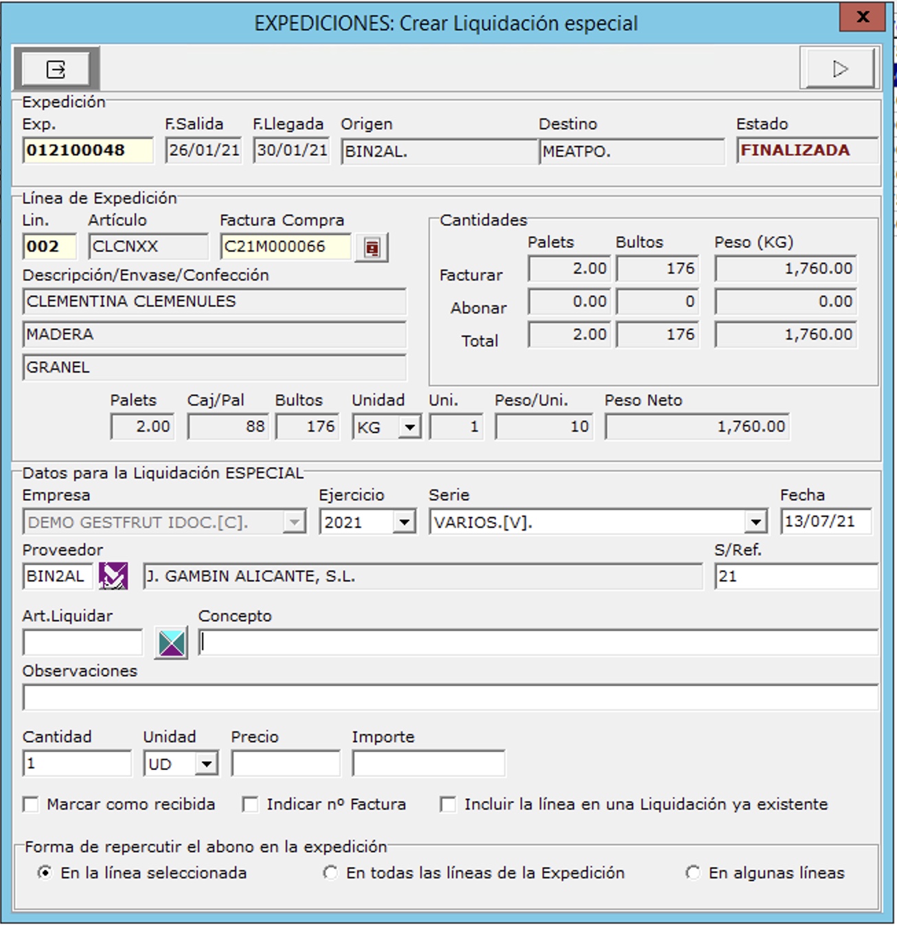 La primera permite crear las cuentas de venta de la expedición y es equivalente al botón liquidar. Con la opción Permiso parcial se puede asignar o quitar a todas las líneas de un proveedor