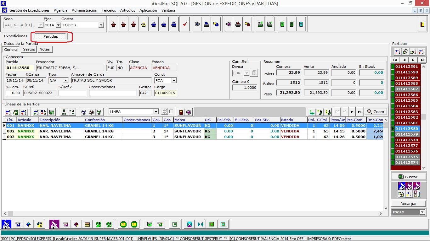 Las partidas se gestionan desde Agencia/Gestión de Expediciones, en la pestaña Partidas.
