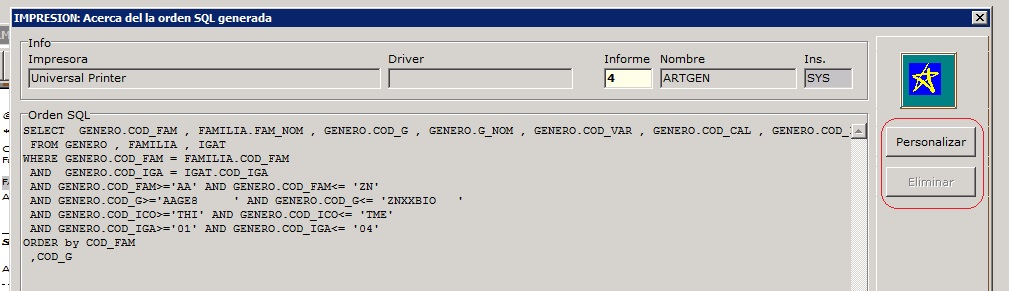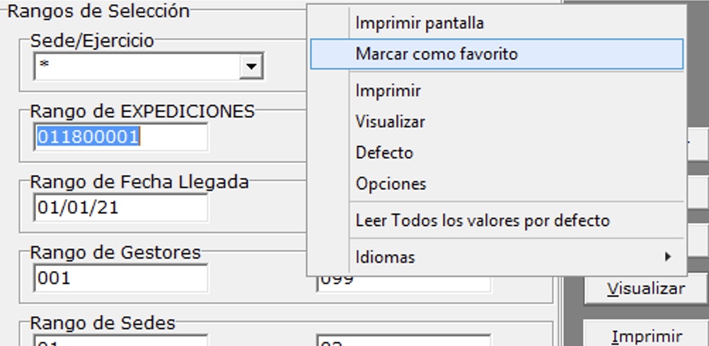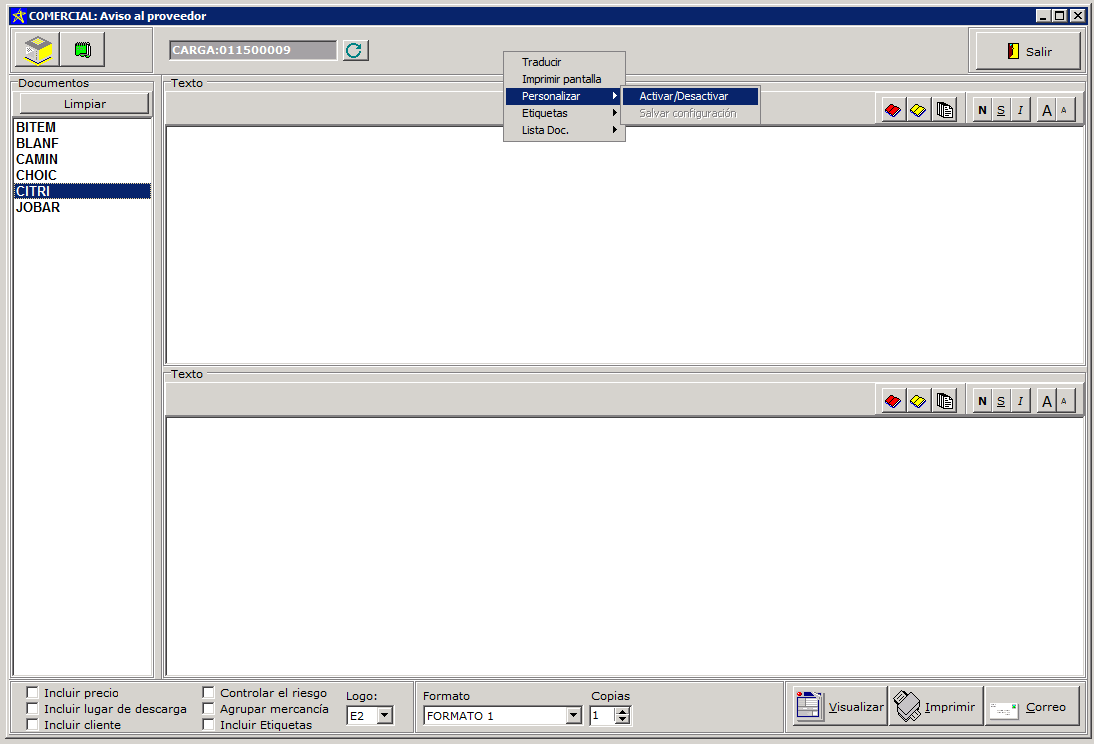 En la pantalla se pueden seleccionar en la parte inferior izquierda el formato del documento y las opciones disponibles. Para personalizar por usuario estas opciones sitúe el ratón en la barra superior y pulse el botón derecho, marque la opción Activar/Desactivar . A continuación marque las opciones y seleccione el formato. Finalmente, en el menú anterior use la opción Salvar configuración.