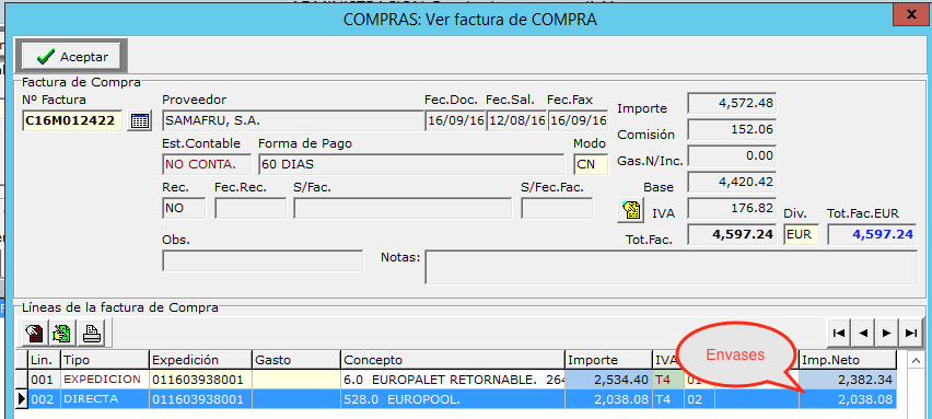 En esta expedición hay 2038.08 EUR de envases, en la pantalla de resultados se muestran así: