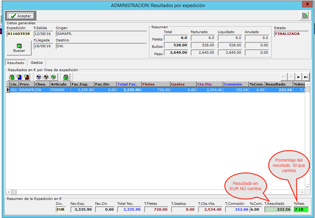 Cuando la expedición tiene envases retornables se facturan al cliente y se liquidan al proveedor por la misma cantidad e importe. En este caso, el resultado en EUR no se ve afectado, pero si el porcentaje de resultados.