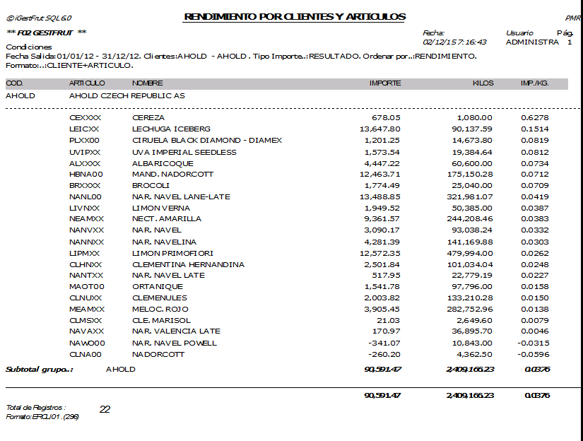 Finalmente en el grupo Administracion/Resultados/Informes Est. de rendimiento se pueden cruzar importes de resultados en EUR (Facturación, compra, resultado) con cantidades (Kilos, Bultos, palets, etc). En el siguiente ejemplo se muestra el rendimiento por cliente y artículo.