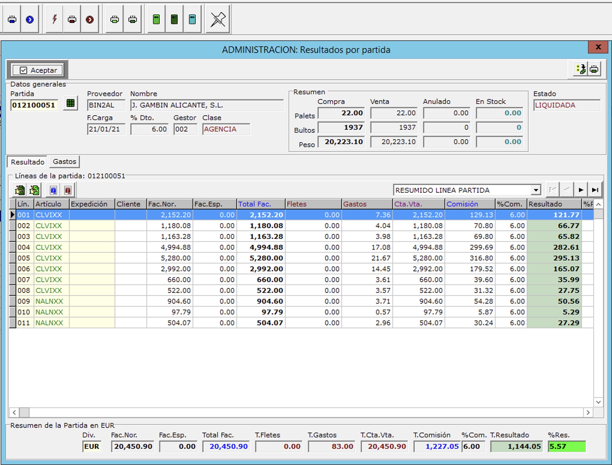 Como se ve la información es similar a los resultados por expedición, la diferencia es que en este caso se muestra por cada partida o compra.