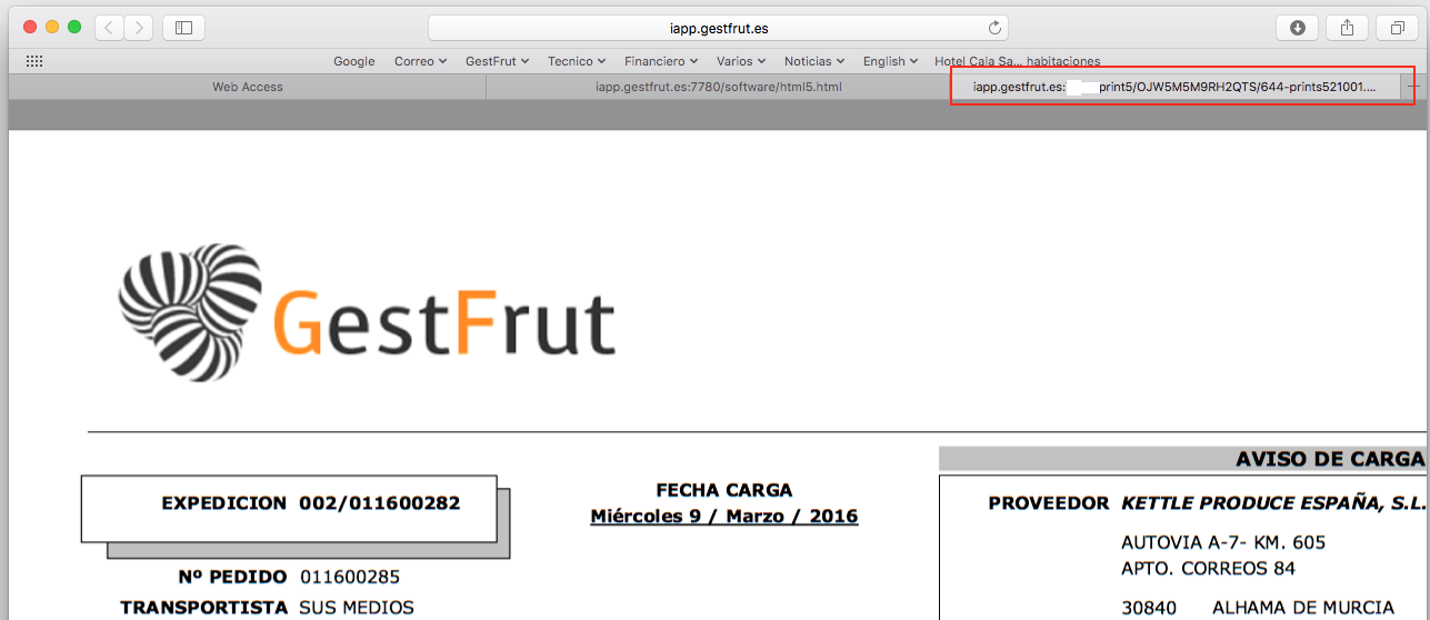 Si se ha realizado la conexión a través de un navegador, al imprimir se creará una nueva pestaña dentro del navegador con el documento generado.